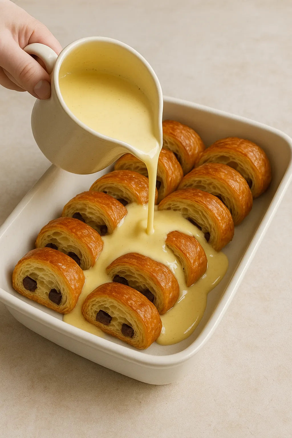 This pudding is even better with day‑old pain au chocolat. The slightly dried-out texture absorbs custard more fully, giving you that soft, rich interior.